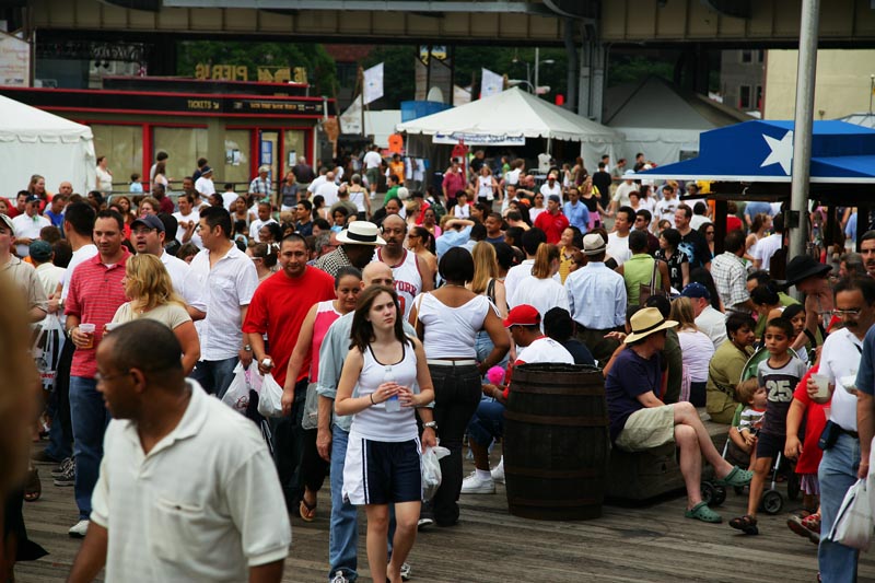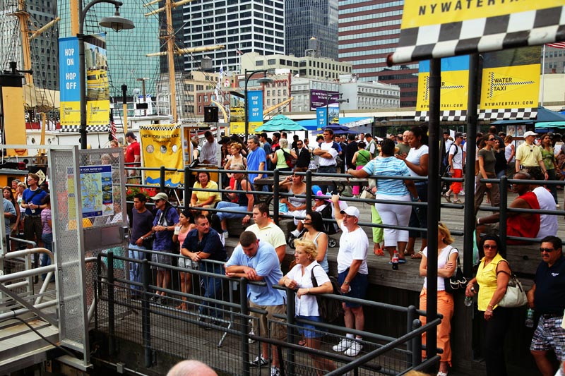 The objective of the journey to the lower east side was South Street Seaport Village. This is a tourist trap with restaurants, gift shops, etc. It is also very popular with locals and tourists alike and the place was a zoo. Here, folks wait to board the water taxi to go elsewhere on the island.
