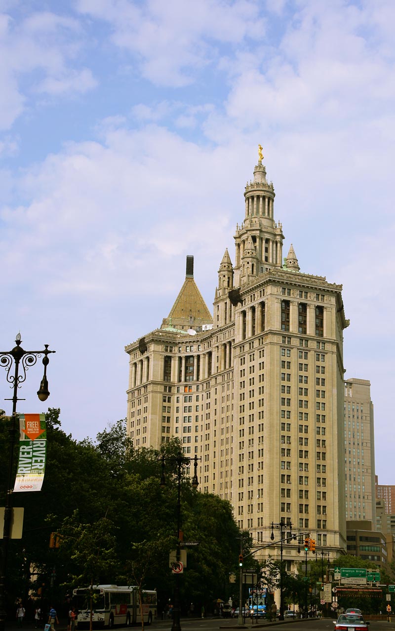 A good view of City Hall on a clear day. Early during our stay on Chambers Street, City Hall was visible from my living room window. Now that the construction is proceeding at 200 Chambers, the tower is no longer visible. This view is from the southwest along Park Row.