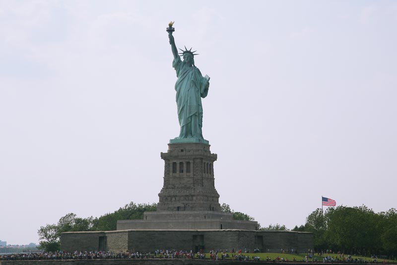 A view of the Statue of Liberty from the taxi. Note the number of people around the base.