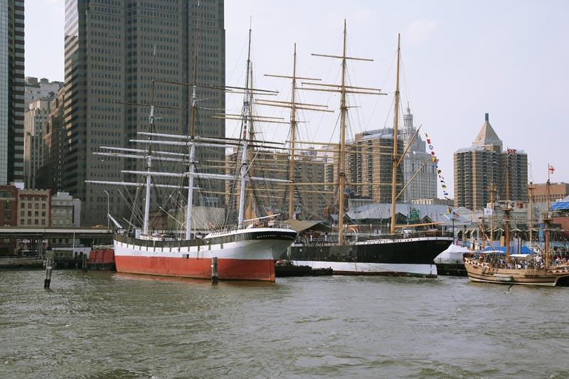 Some of the old sailing ships at the maritime museum at South Street Seaport Village. City Hall is visible to the right of the far right mast.