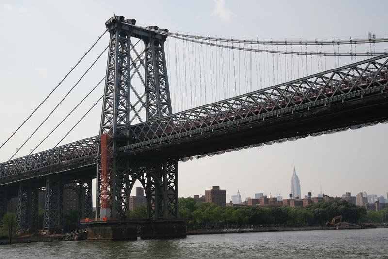 Williamsburg Bridge. Note the all steel construction and the Empire State Building (ESB) in the distance.