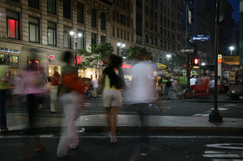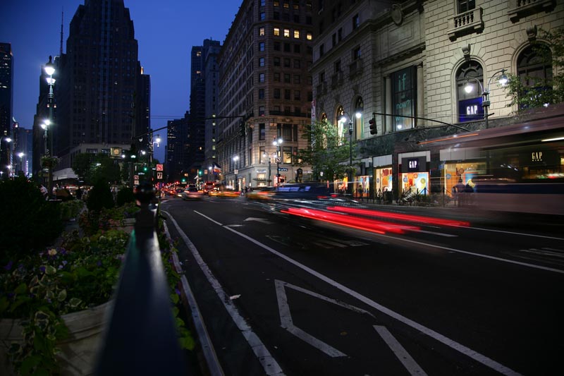 Midtown at dusk. Car tail lights on Broadway produce ghostly trails at slow shutter speeds.
