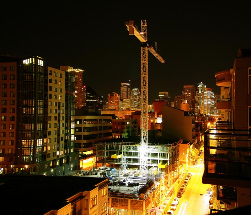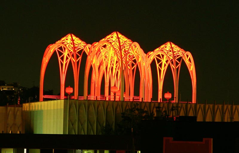 Later that night, I got this shot of the domes at Seattle center. The lighting changes all the time, here it appears red but the domes are white.