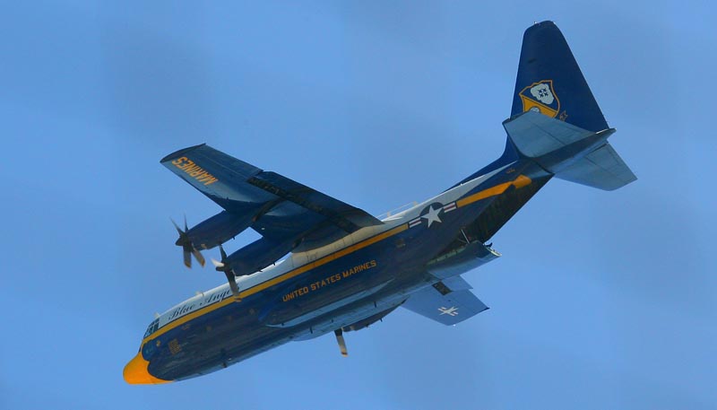 I brought my long lens for my 1Ds and the shutter speed was fast enough to freeze the props on this C130. I shot this through the netting, and it was not until I could get the photo onto a bigger screen that I saw that the cargo door of the plane was open and there was a guy sitting on the ramp. Look carefully and you can see his foot and his face in the cargo bay door area. And I thought that I had the best seats in the place!