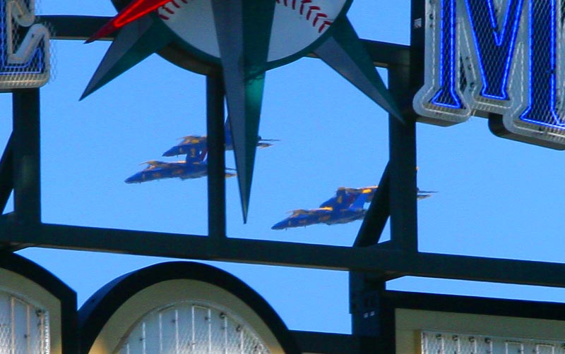 It was a beautiful day in Seattle and the game was co-incident with the Seafair festival, so we were also treated to the Navy's precision flying team the Blue Angels. Since it was sunny and clear, we slathered on the sunblock and headed to Safeco Field (along with most of Seattle). The park was nearly full to capacity with the total attendees counted at 41K.