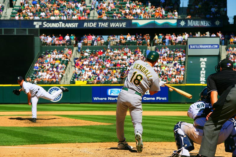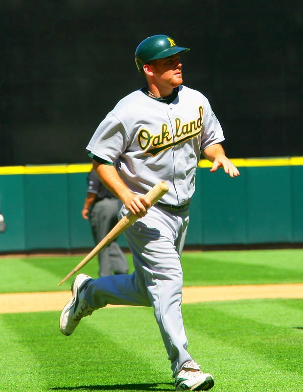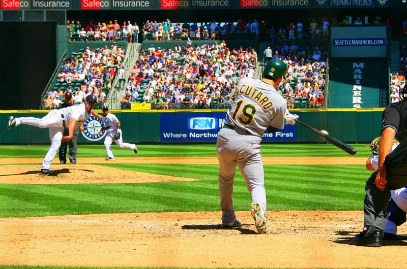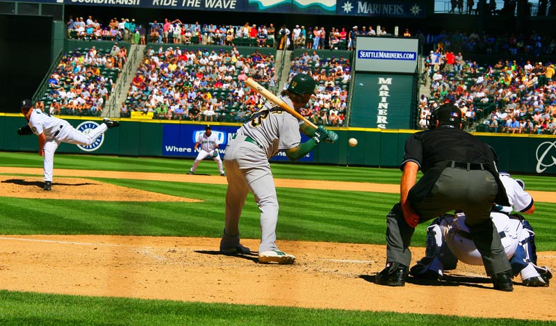 One of the Oakland players hit the ball so hard that he broke the bat.