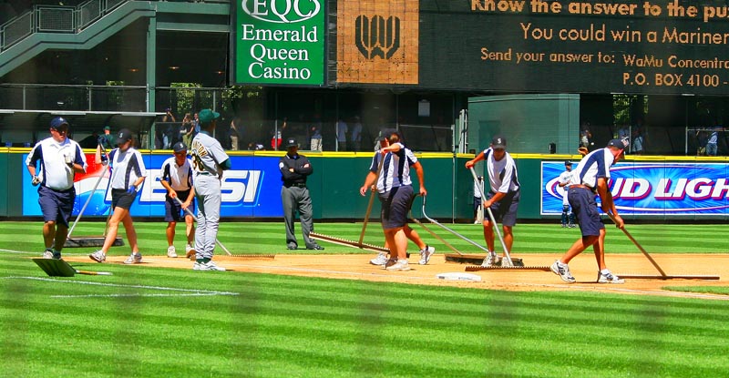 During inning changes, the grounds crew appeared en-masse, like ants raking and smoothing the field.