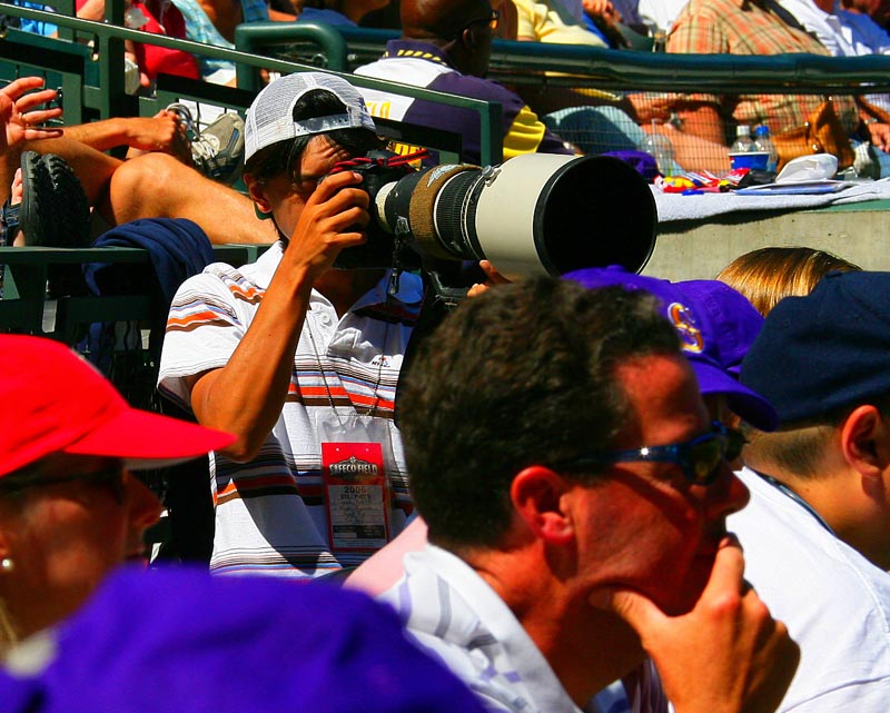While sitting in my seat, I was accosted by one of the ball park personnel and told that I could only use my photos for personal use. They targeted me because I had a "long lens". Ha! This fellow has a long lens. But, he also has a badge to ward off abuse. To their credit, they only engaged me once and then left me alone.