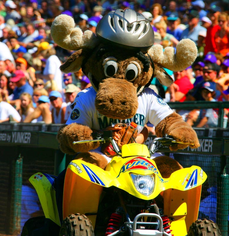 This whole scene had be laughing. As the mascot rounded the field on a quad, the video board was saying that he was promoting "helmet safety week". He circled the field twice, first in this photo and then again with one of the Mariner support gals on the seat behind him. You should never ride double on a quad. In fact, it will get you a ticket if you ride double on any BLM lands. And, she did not have a helmet. Finally, I am sure this was due to the costume, but his helmet is for bikes, not quads. All in all, a flawed execution of a good concept.