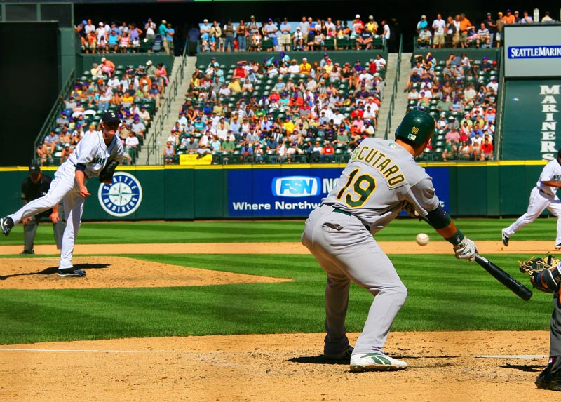 Scutaro engages the ball, resulting in a hit for Oakland.