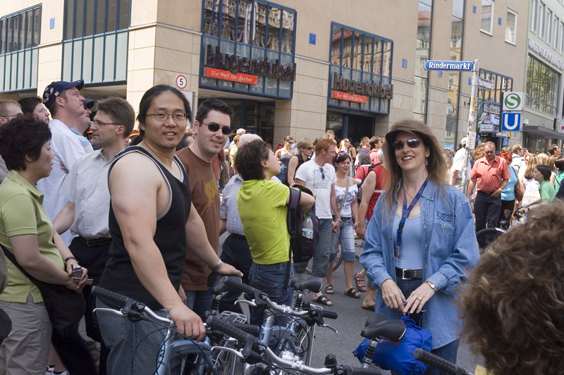 After we finished our formal work actions, we had to change hotels. The new hotel is in the high rent district. None of us spoke German but after awhile, we managed to translate the hotel name Vier Jahreszeiten into english: The Four Seasons. Ah, that explained alot. There were plenty of foreigners in the hotel besides ourselves. Indeed, the Saudi delegation purchased most of the top floor and had guards stationed at the lifts to prevent unwanted guests in their area of the hotel. And, there were tons of Mercedes sedans outside the hotel awaiting their riders. One of the amenities of the hotel are loaner BMW bikes. By registering with the concierge, you could borrow a bike for up to 3 hours. Mike, Todd, Kathleen and I got bikes and headed for the central park and beer garden. Eric, on the other hand, rented a real BMW bike -- a motorcycle. He went off on a full day road trip to the Alps and some famous castle there. We saw him later in the day and he told us an ugly story about how he tore his hamstring and was unable to make the ride on the bike. Sadly, he did not even get out of the parking lot. The good news is that the fellow at the rental place exchanged the motorcycle for a car and he did the trip anyway, but in pain.
