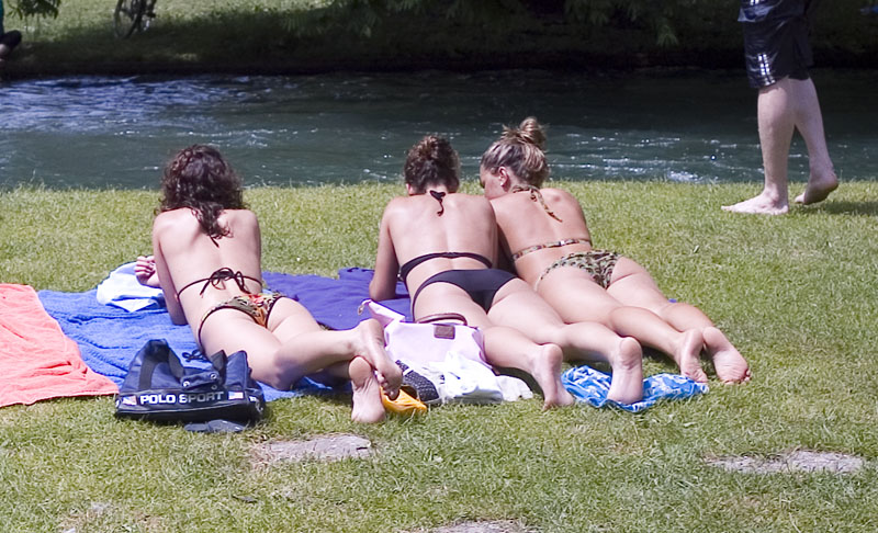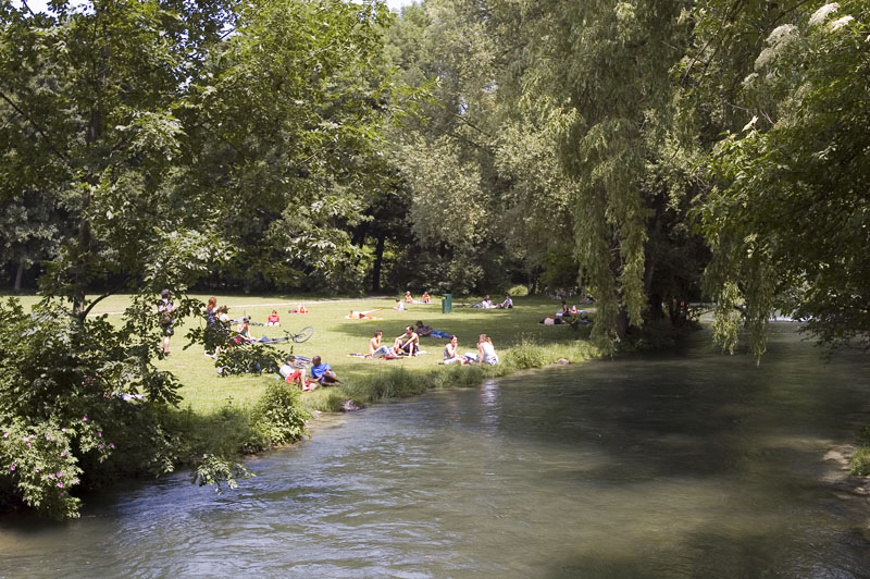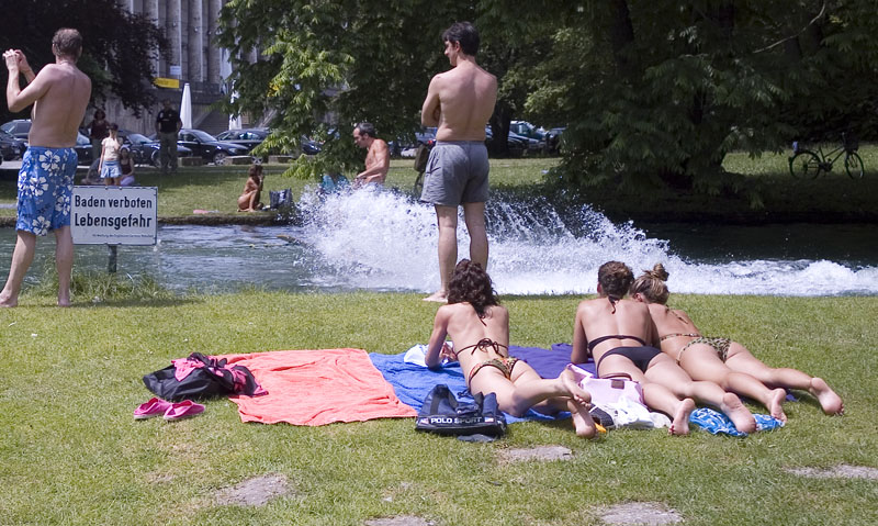 Bikes are definitely the best way to see the city. Bikes are easy, fast and no hassle to park. Plus, the park was closed to cars, so we were able to traverse the park from end to end with ease. The park is big, perhaps 5km long and has contained within it forests, meadows, several rivers complete with waterfalls, a lake and of course several beer gardens. We were somewhat suprised to see that the locals sunbathe nude in the park and skinny dip in the river. While there were many sweet, young things, one of the laws of nature says that you will see none of them in the river or without clothes. I am not sure who created that law, but to my eyes, it was universally enforced. The shots below are what we saw.