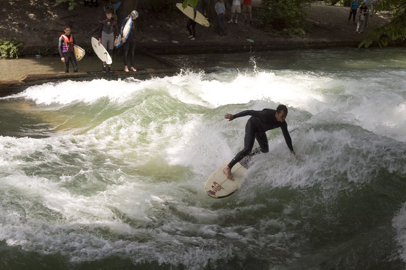 One of the rivers heads through a weir. The outfall creates a giant standing wave allowing stationary surfing. Here a fellow in a wet suit navigates the wave. There were lines of folks on the banks waiting their turn to jump in. Only one person at a time could be in the hole.