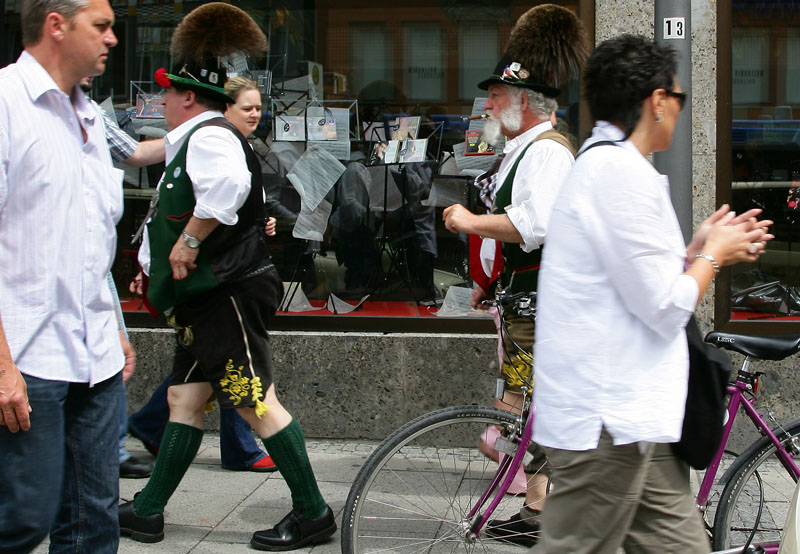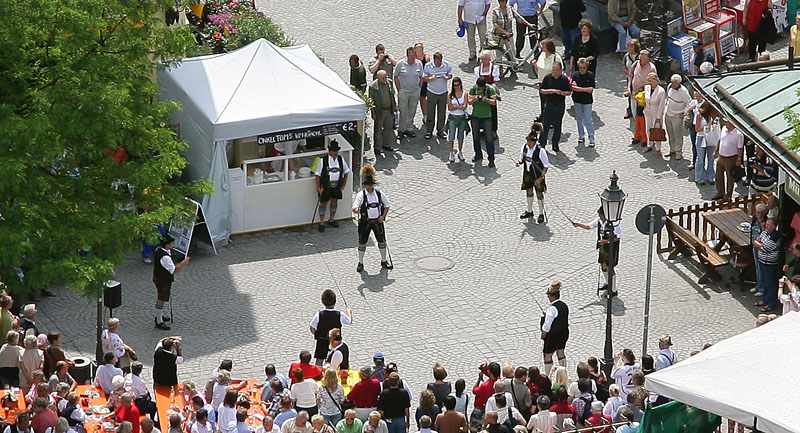 We were high up on the tower and heard what sounded like whips cracking in the distance. I looked down into the crowd and saw the locals in Bavarian costumes cracking whips in unison to the music. Here 4 of them perform. The crowd liked it.