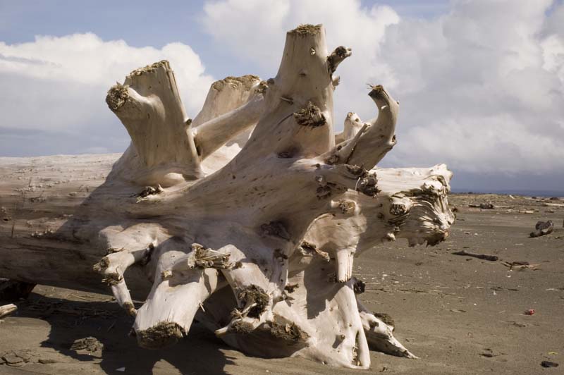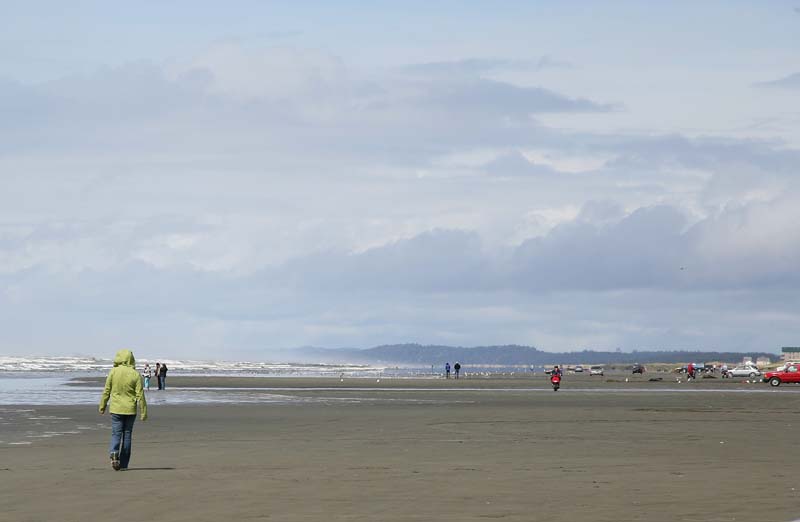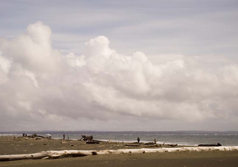 Plenty of beach combers walk at the tide line. Note the large trees that are driftwood.