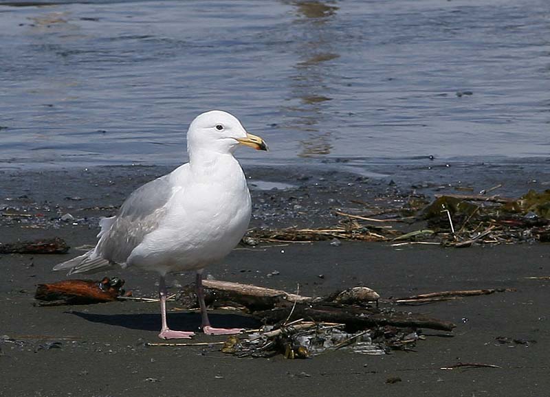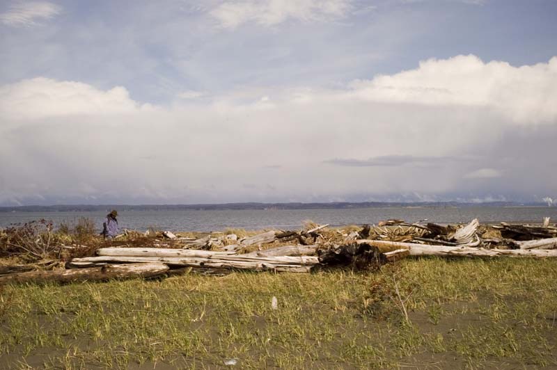 Kathleen inspects the flotsam and jetsam at the water's edge. Note the large driftwood logs.