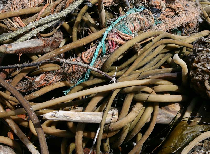 A knotted tangle of kelp, rope, fishing lines and driftwood.