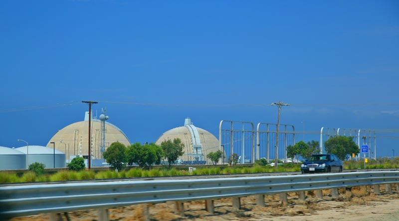 Here is a hot tip: driving and attempting to look through the viewfinder of a camera is somewhat risky. So, that is why I did the "point and pray" method. Here is a shot of something guaranteed to strike fear into the hearts of most folks in southern california: the San Onofre Nuclear Generation Station (aka SONGS). The hemispheres are the containment domes for units 2 and 3. Unit 1 has been offline for years and is not visible (but to the right of unit 2). SoCal gets a substantial amount of its energy from these plants. The claim is that the containment can withstand impact of a fully loaded 757 "at speed". Oddly enough, that claim was made many years before 9/11 and it is interesting that they chose that metric of impact resistance. Since all of San Diego county is down wind of SONGS, we were sweating bullets when the WTC collapsed. We assumed that if SONGS was hit and the containment ruptured, the entire county would be contaminated. Gladly, that did not happen.