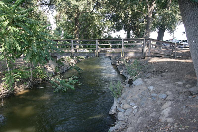 We reached Visalia without incident and Kathleen informed me that she had a real and immediate need for a vanilla shake. After searching town, we found a Carl's Jr. and turned in. Behind the resturant was this creek. Actually, it is probably an irrigation canal disguised as a creek. I never asked, but it was cool so I took a shot.