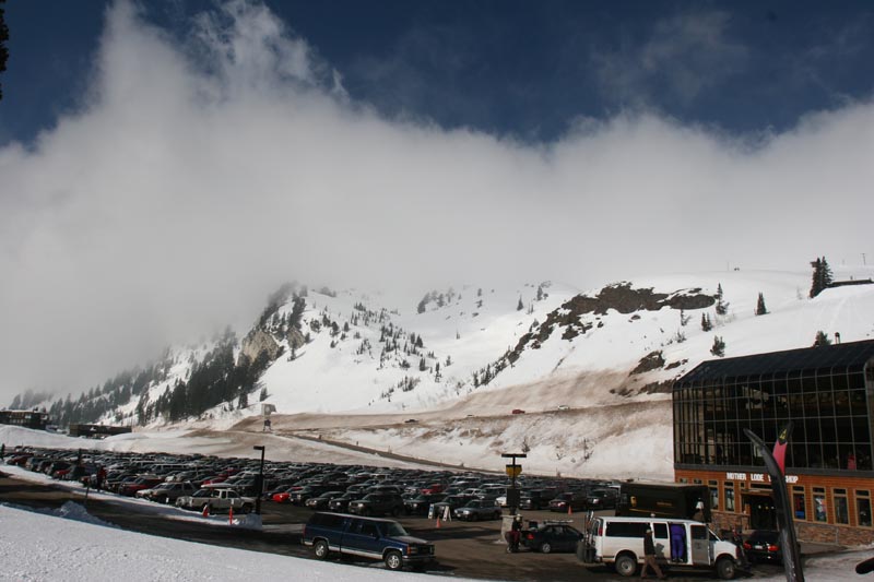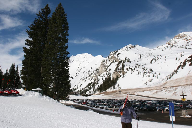 The base area at Alta. View of the south face of Little Cottonwood in the background.