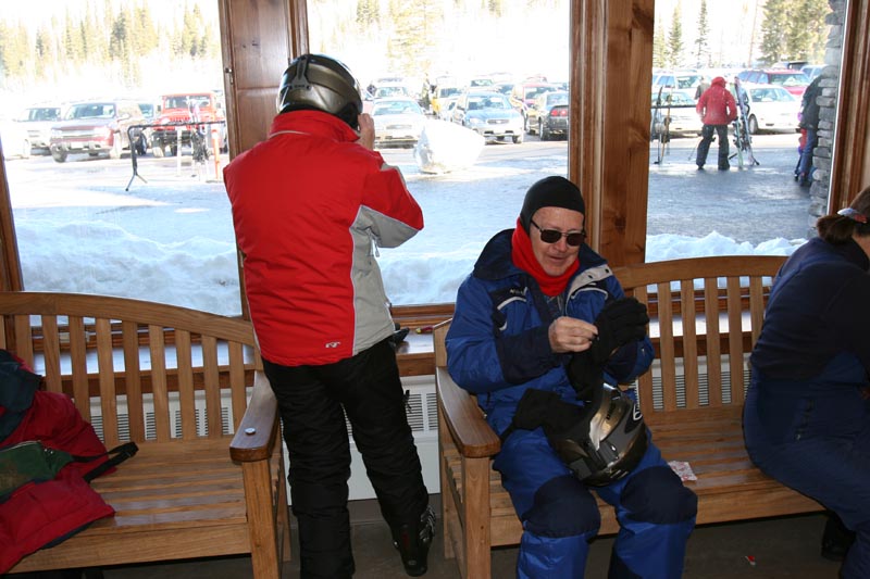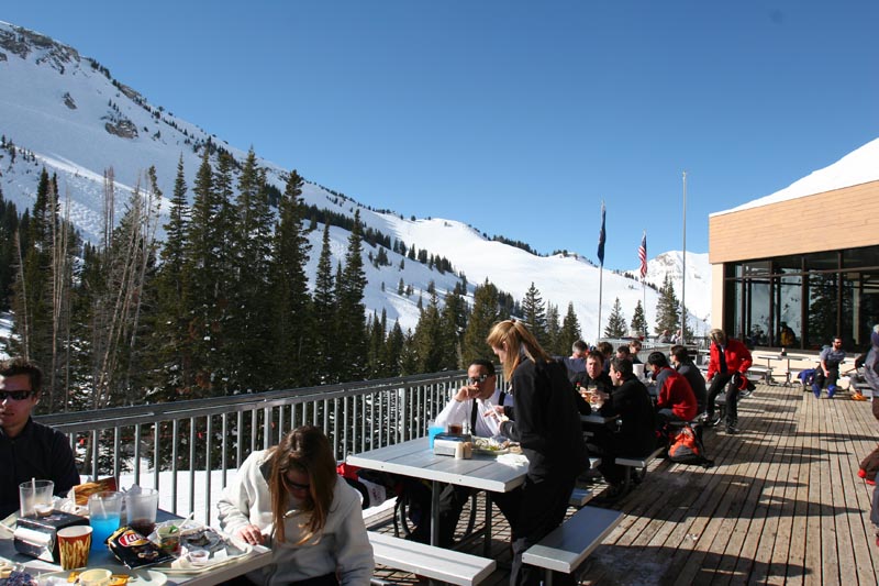 End of the first day at Alta. The conditions were nearly perfect. As we were preparing to leave, Bob got a great idea: leave our skis at the shop at Alta and have them do a tune-up. That way, we would not have to haul them home and they would be in great shape for the next day. Sadly, the shop ground the wrong angle on our edges (all 4 pairs) and the next day were were out of control. While none of us fell, we did return the skis to the shop for some remediation. They did improve a bit, but they were still unstable and chattered terribly. We skied the rest of the day, but had to take them to another shop for more work to un-do the "repairs" done by the other shop. They did give us our $100 back. But, the money was a small consolation. The funky skis pretty much ruined an otherwise great day. As a saving grace, we did have a great lunch at the Collins Grill at mid-mountain.