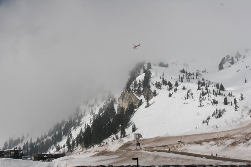 The "Powderbird" copter based at Snowbird (just down the canyon) hauls ass back to base before the weather closes in. The copter is used for medical evacuations and hauling heli-skiiers to the top of the ridge.