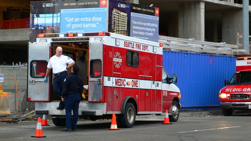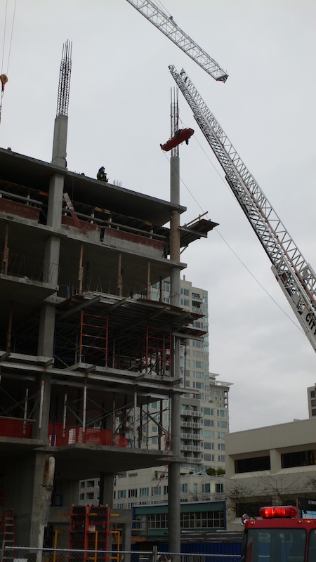 On Monday morning, I was on my way to work, I was confronted with the normal things. A view of the Space Needle and other sights on would associate with the Belltown area of Seattle. But, there was more. The building across the street from my workplace had been under construction for some time. Sadly, one of the construction workers suffered an on-the-job accident that require a rather dramatic rescue operation. I only had my "briefcase" camera, so the photos were not up to normal standards. The photos below are what I saw.