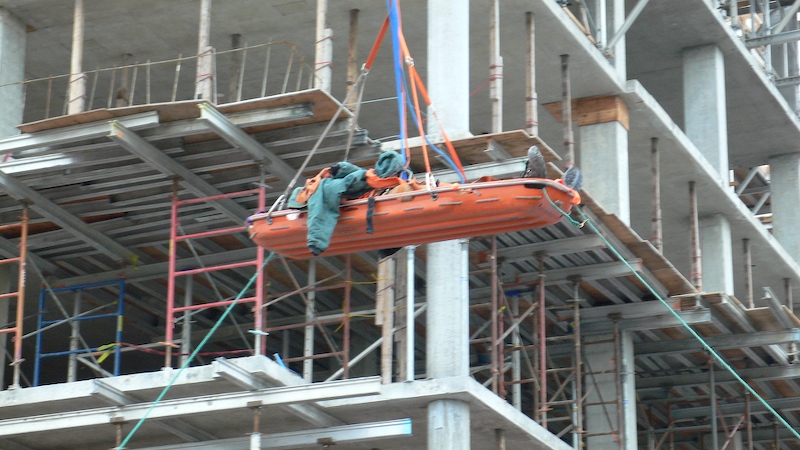 When I rounded the corner, I saw that the ladder truck was deployed and noticed that they were lifting a Stokes litter to the top floor of the building.