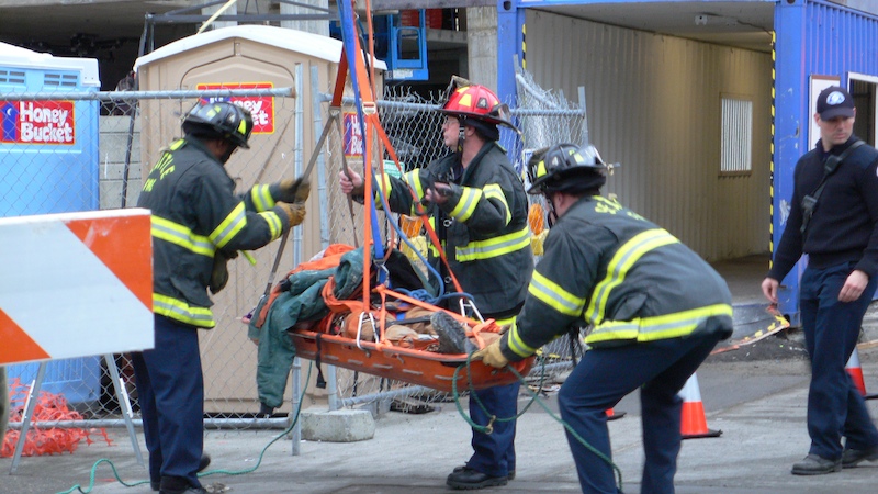 I was in EMS way back when. That is how I put myself through college. Seeing this rescue brought back a flood of memories, most not so savory. I was not able to determine what was wrong with the construction worker or how seriously injured he was. When I was working, my most hated question was "what happened?" followed closely by "is he OK?" and "will he be OK?". I used to spend my down time thinking up 101 smart ass answers for these most stupid questions. But, remembering my reaction to these questions, I did not pester the fire fighters. Probably just as well as they may have given me one of the smart ass answers that they have undobutedly thought about in their downtime.
