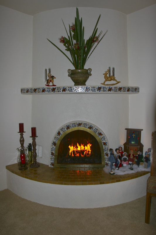 The recently refurbished fireplace, nice adorned with Christmas figurines.
