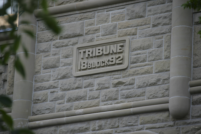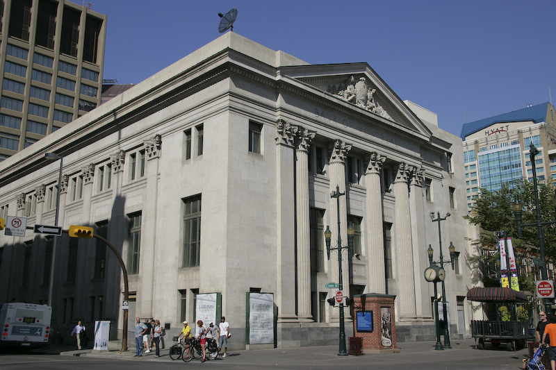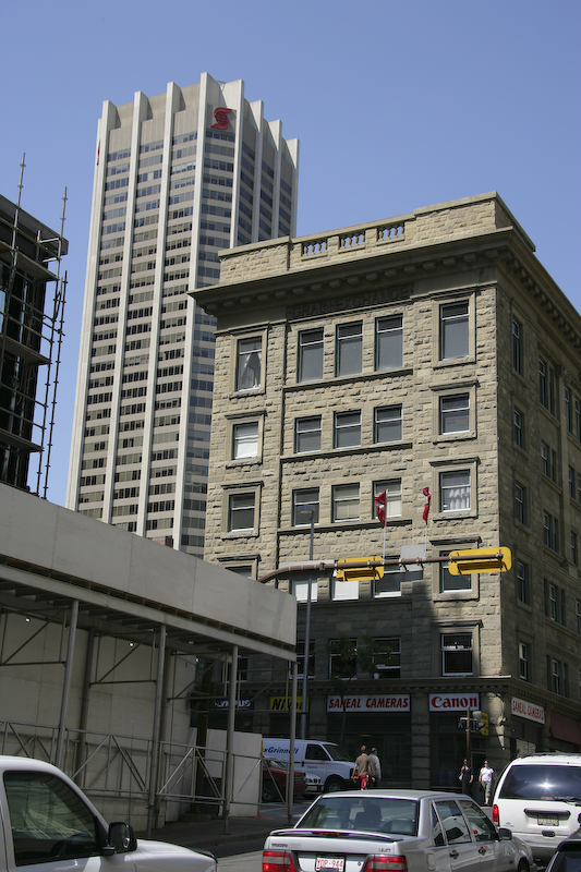 Calgary is an interesting mix of old and new. The old building in the foreground is the Grain Exchange -- the name is hidden in the harsh shadows of the eve under the roof. In the background, are many large, modern skyscrapers.