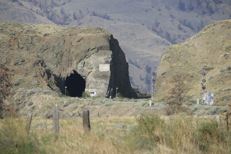This is an interesting study in how construction techniques have changed over the years. Before the advent of the bulldozer, moving large amounts of material was difficult. The tunnel on the left is the old route. But rather than widening the tunnel, it was easier and more cost effective to blast and remove several times more material to produce the 2 track cut on the right.