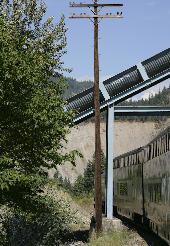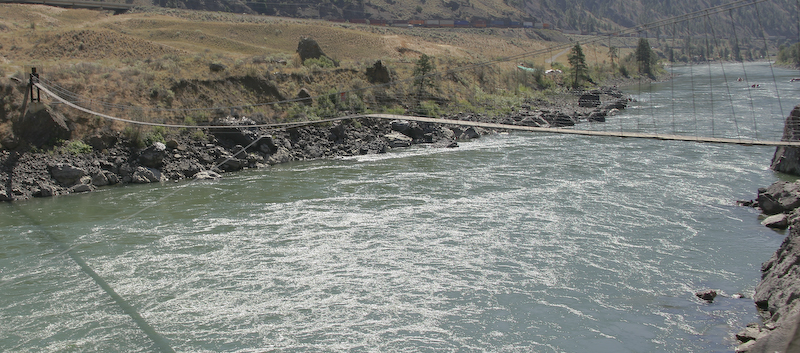 This bridge makes me pucker just thinking about it. The walkway is constructed of 2 2x12 planks. Note the stabilizing cables on the lower left. The walkway spans the North Thompson river.