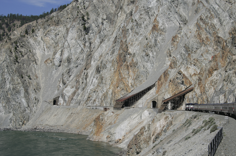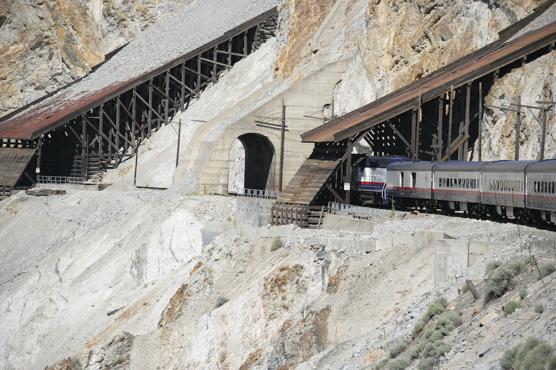 Since the mountains are continuously bleeding rocks, this causes operational issues for the railroad. Here, you can see scree sheds that were constructed to divert the flow of rocks over the tracks.