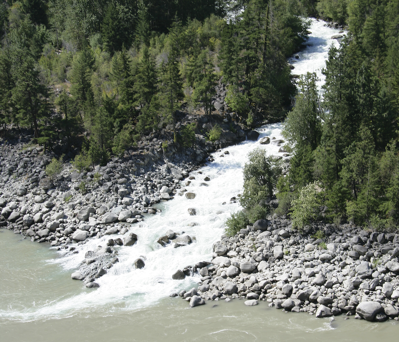 The approach to the Hell's Gate section of the river. Note the bridge over the river and a fish ladder in the lower right.