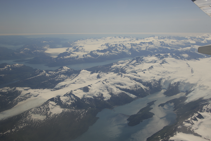 The photo above in no way does justice to the scene. Sadly, my seat was on the sun-side of the plane, so that fuzzed the image. Plus, shooting through dirty, scratched plexiglass that they use in plane windows does nothing to enhance image quality. But, it was the best I could do. Our first view out the window was of this awesome field of glaciers with ocean inlets interspersed.