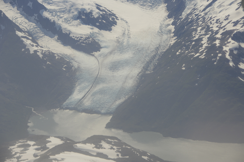 Just past the mine (you can see the tank farm in the lower left of the photo), we spotted this huge glacier flowing into a lake. Note the striations in the ice flow.