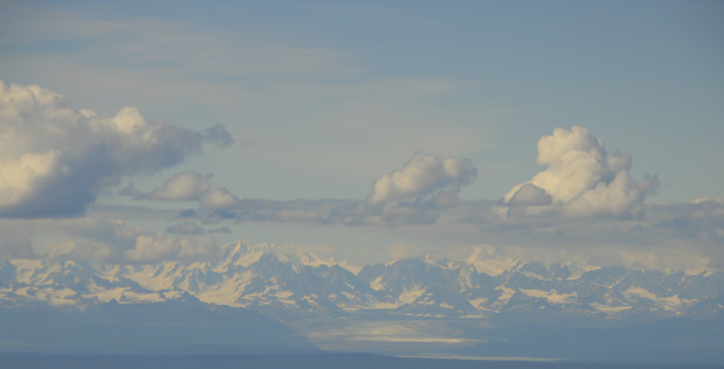 As the aircraft turned on final approach, we got a view of the mountains to the north. These are very tall with many glaciers. This is stil somewhat in the sun and therefore the colors are washed out.