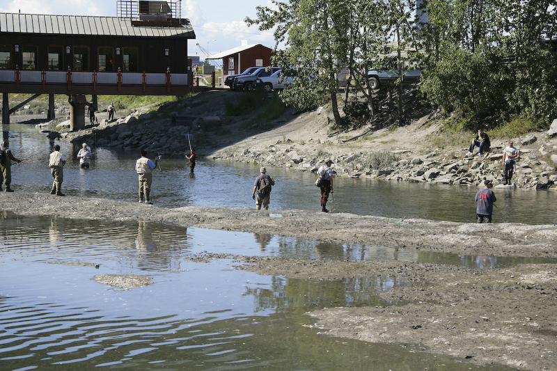 We decided to spend the balance of the day hiking around downtown Anchorage since we did not have a car. Just outside ouf the hotel, there was a salmon fishing derby in progress. We polled the fisherman several hours later and nobody was catching anything. The river was too high they claimed. I find that a bit hard to believe.