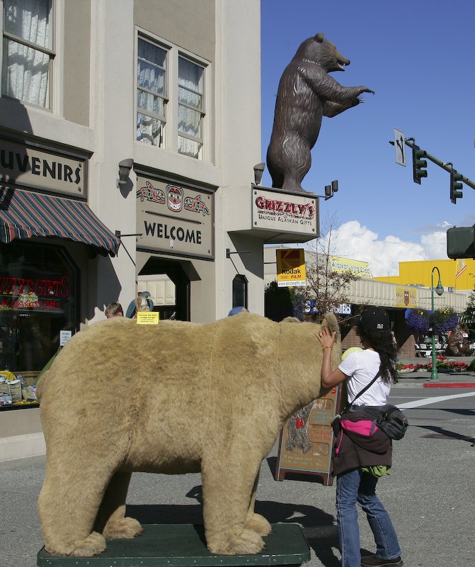 Munich had its lions. Seattle has pigs and Calgary has cows. Anchorage has grizzlies. This one was popular with the tourists for photo ops.