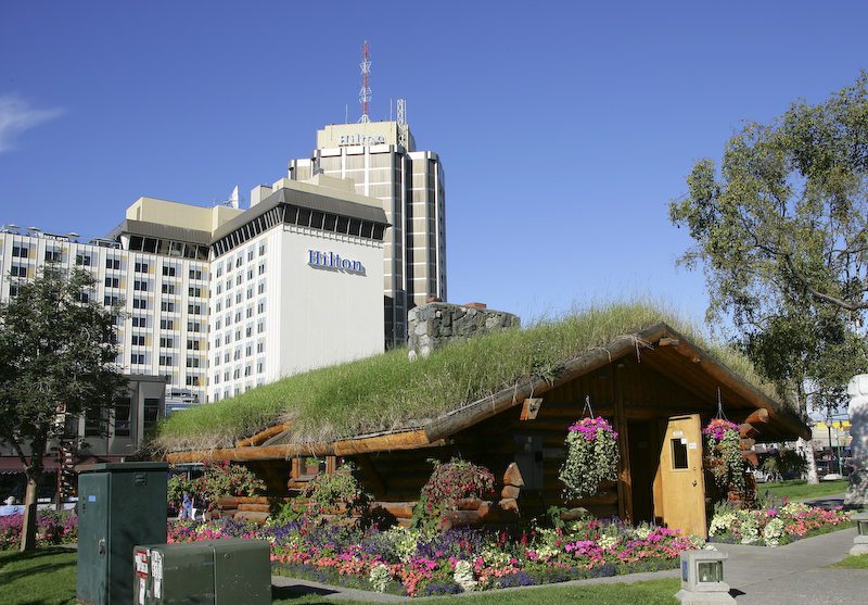 The old and the new. The cabin is the visitor center and is constructed in the traditional style. The Hilton is the highest structure around and also serves as the television tower. The folks in the visitor center stated that when the 1964 9 point earthquake hit, this building was one of the very few that survived.