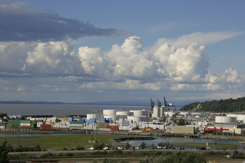 As we got closer, I could see some kind of minig operation. Note the facility on the edge of the water near the center of the photo. There is a tank farm to the right of the facility and glaciers above.