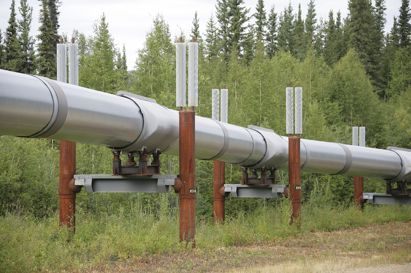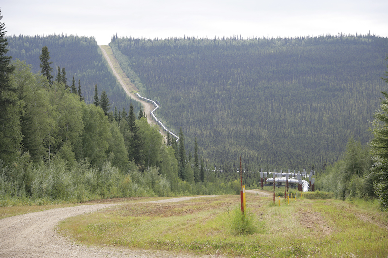 The pipeline travels 800 miles from the North Slope to bring oil to points south. In a substantial portion of the route, the line is above ground to prevent damage to the permafrost. Here, the line is on sliders that allow for expansion in the pipe due to thermal changes. This was a huge engineering effort.