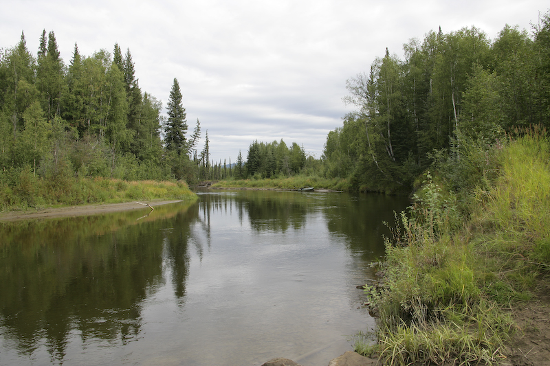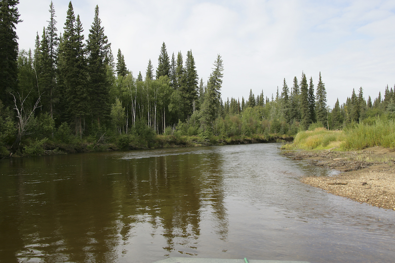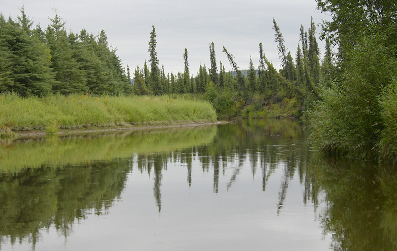 The river looks calm, but shortly we reached challenge 3: debris in the pump inlet. Dan's boat has a special ability purge debris, but no matter how hard we tried, we could not dislodge the debris. So, we motored on at about 3 mph since the jet could not produce much thrust due to the blockage. Conversation turned to what would be required to clear the debris including going for a very, very cold swim, hoisting the boat out of the water using a tree. And, we also discussed walking out the 6 mile path to the highway and using the satellite phone to have someone pick us up and staying the night at the cabin. Before we could reach the cabin, we were confronted with challenge 4: stuck on a gravel bar. Since we had minimal thrust and therefore minimal steering capability, we hit the bar and became stranded. We used the paddle as a lever and rocked the boat. It took awhile, but eventually the river moved the gravel that held us up. And, as luck would have it, the gravel also stripped the debris from the bottom of the boat, freeing the inlet port for the jet pump. We were off at normal speed for the cabin!