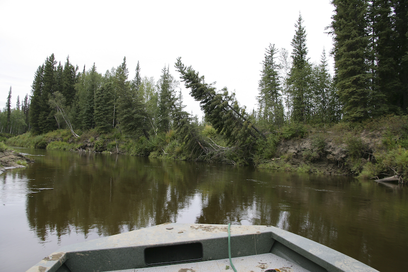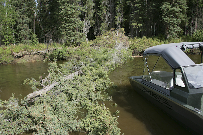 Cutting from the boat was awkward and dangerous. If you slipped with the axe, you could cut through the hull of the boat and that would be bad. We were soon joined by another boat with folks heading to their cabin as well. The group took turns chopping and soon we breached enough of the tree to allow the boats to pass. Once we were by, we switched drivers and I took over. Shortly, we hit challenge number 2: another tree across the river in a blind spot around a tight turn. I was confronted with a tough choice: throttle back and hit it with no steering control (due to the fact that a jet drive loses steering when the pump is not engaged) or hit the log at full speed. I chose the latter and the boat skimmed over the log with no damage to the boat or passengers. It was tense, but Dan's aluminum hull boat was designed for just such a situation and has plastic skid plates on the keel to make the sliding over obstacles easier.