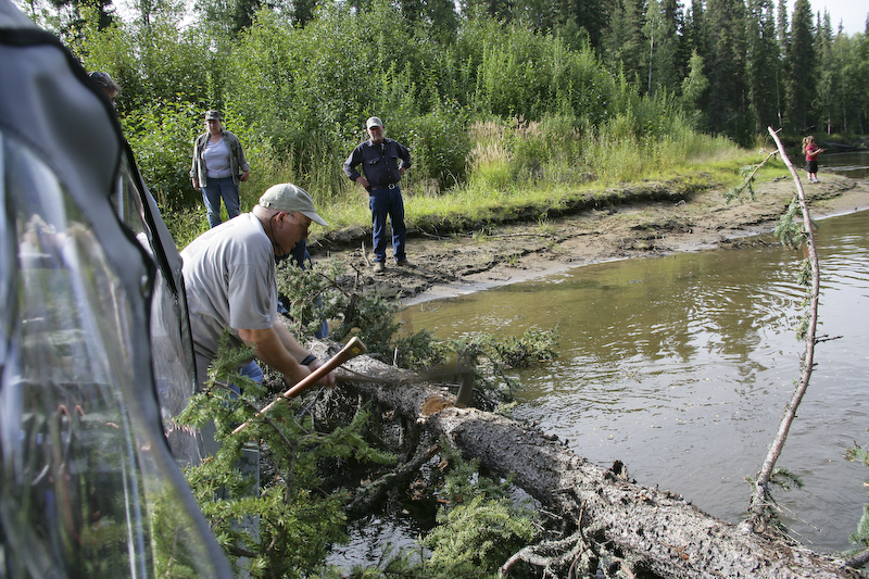 There were a number of challenges this day. Challenge One: a set of trees had fallen across the river totally blocking our ability to go down river. We were going to abort, but then realized that we had an axe on board. So, we went to work.