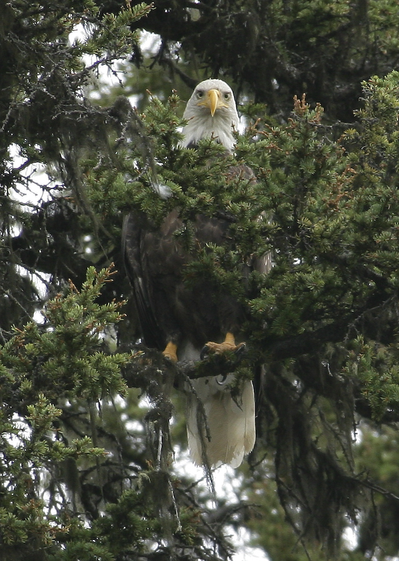 Shortly, we spotted this bald eagle in the trees above us. He is looking us over closely before he got bored and left.