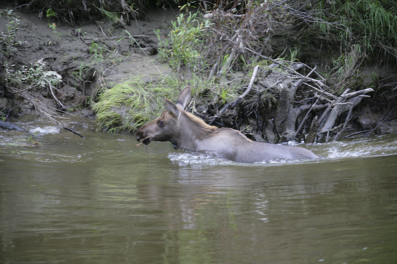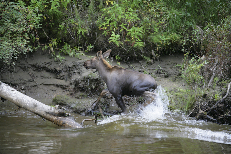 We came around a corner pretty fast and startled this baby moose. He started swimming toward shore.