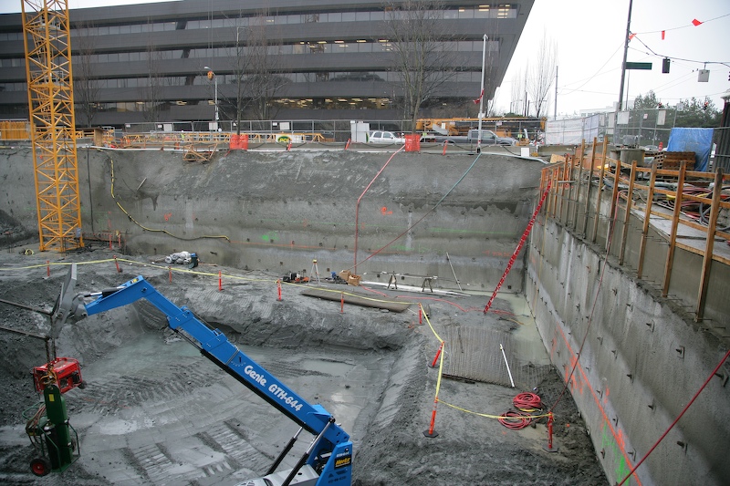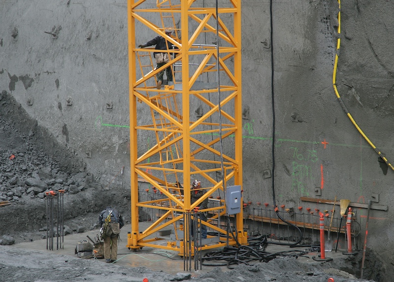 We walked to the base of the construction site to watch the crane being assembled. This is a view into the foundation pit. Note the base of the crane mast on the upper left.