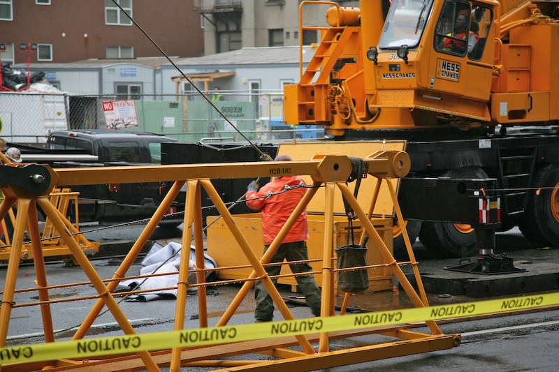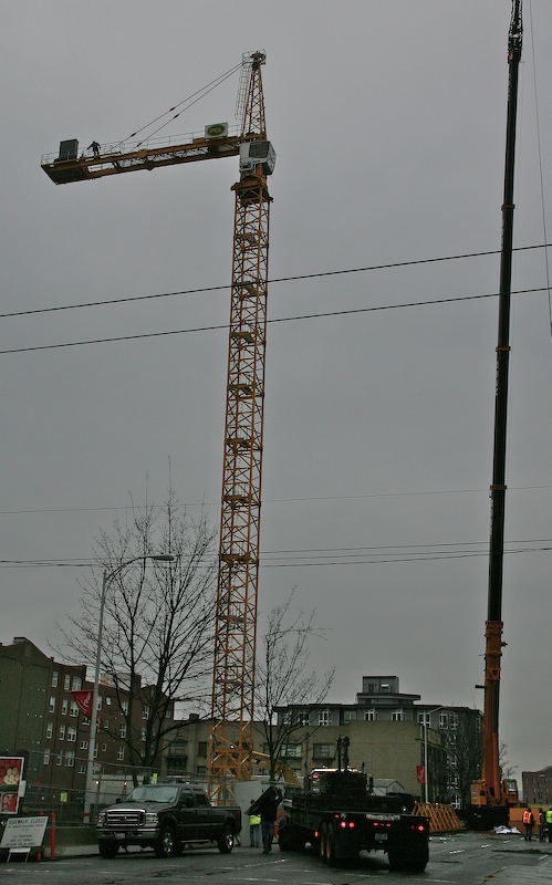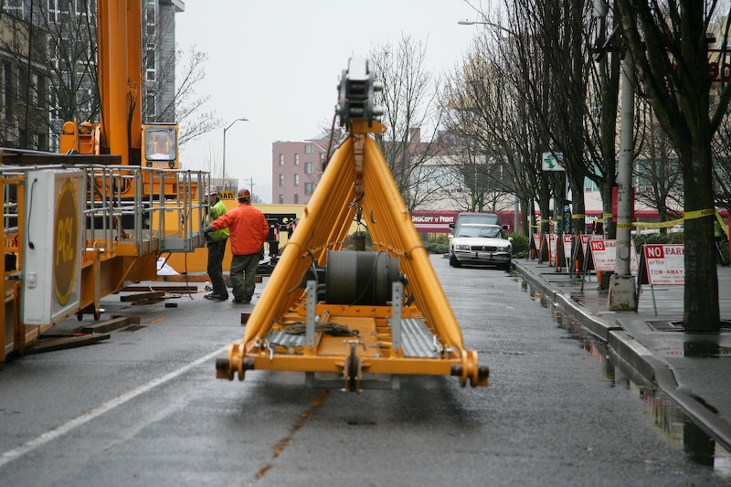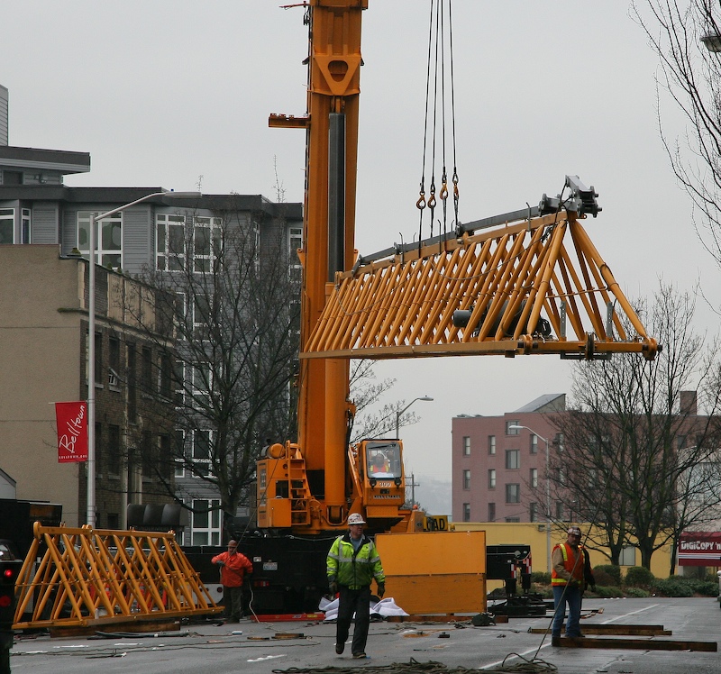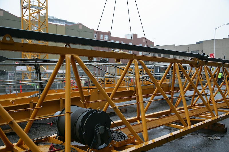 I see lots of new building construction in downtown Seattle and nearly every site has a large crane that supports the construction effort. On Saturday I awoke to a view of a construction crane undergoing full assembly. The photos below are what I saw.